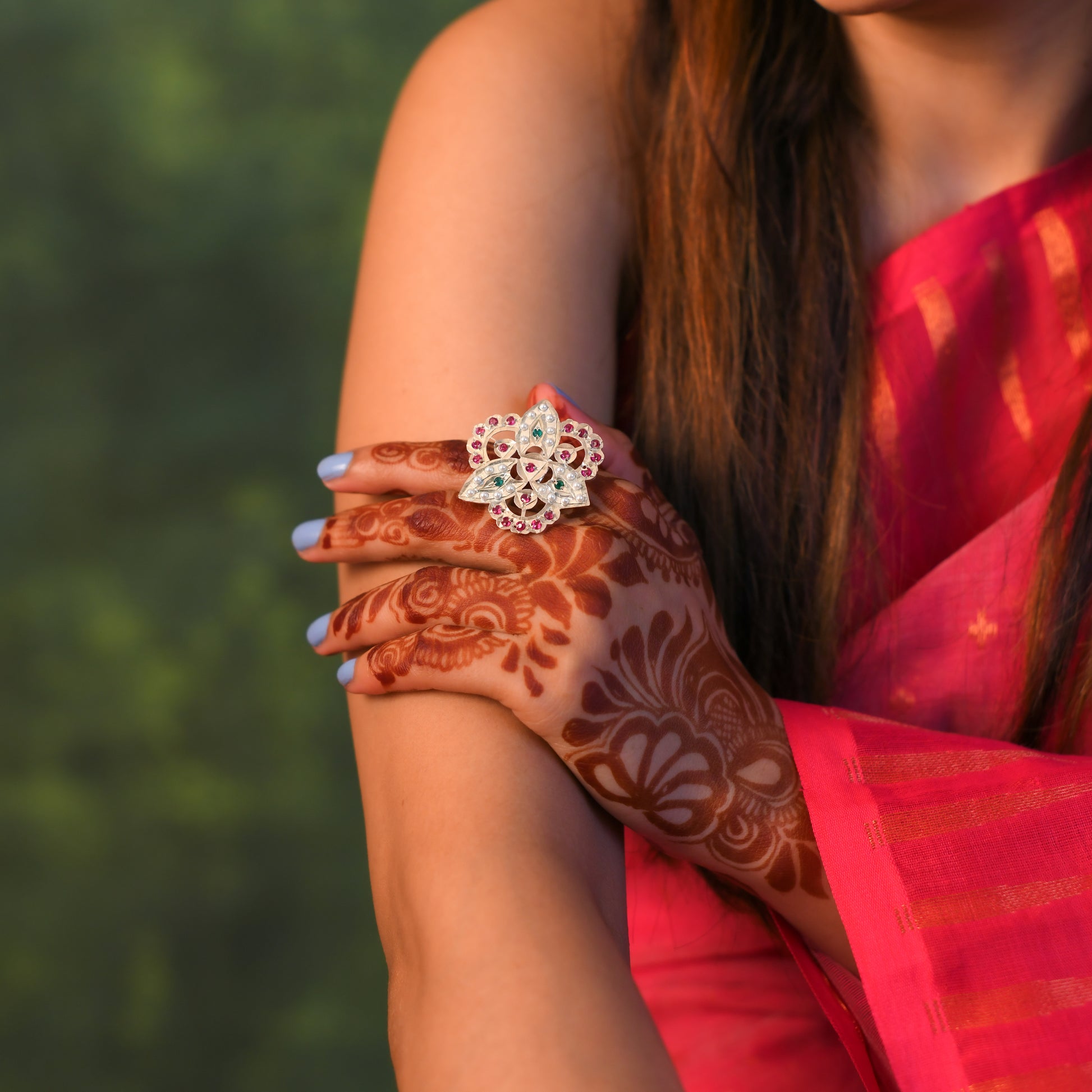 The Teen Patti Ring, encasing three leaves, is an intricately crafted floral design that captures the handcrafted elegance. Adorned with sparkling imitation sparkling stones and radiant accents, this exquisite piece is perfect for enhancing both traditional and modern looks.