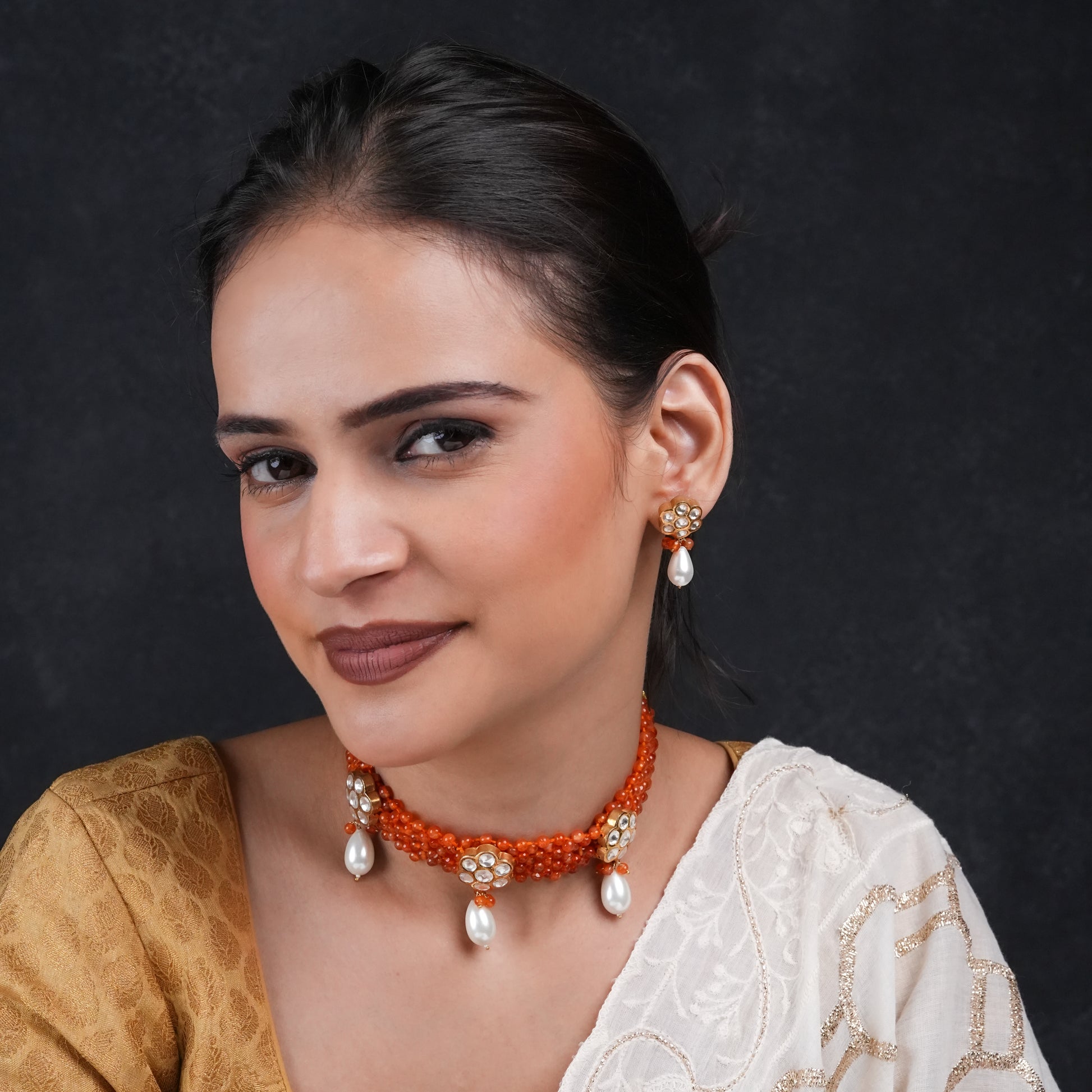 Drape yourself in the radiant warmth of a festive sunrise. This exquisite choker set is a celebration of vibrant energy and royal craftsmanship, designed to illuminate your most cherished moments with an unforgettable glow.