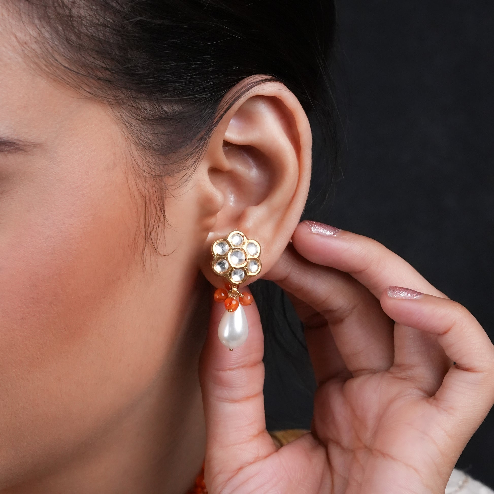 A lush band of fiery Carnelian beads forms the heart of this necklace, punctuated by magnificent stations of traditional Kundan work. Each station, handcrafted from Gold Plated 92.5 Silver, is centered with a luminous pearl drop. Lovingly handmade as a one-of-a-kind creation at the Totapari Studio, this designer set includes perfectly matching earrings to complete your regal look.
