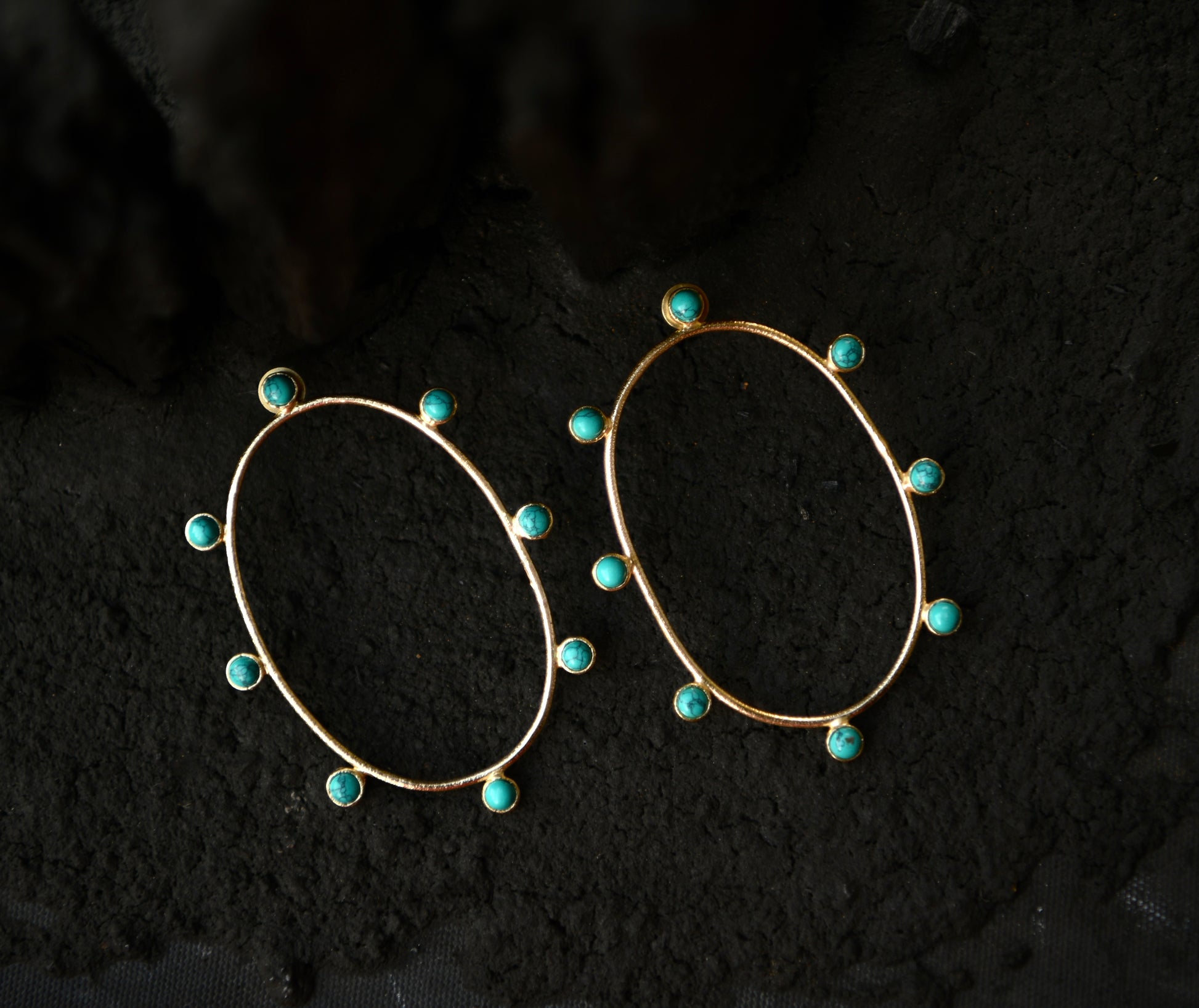 Make a bold statement with these gorgeous Turquoise Hoops! Adorned with delicate turquoise stones, these earrings are sure to draw attention to your unique style. Perfect for any special occasion, they're sure to turn heads and bring a touch of glamour to any ensemble.