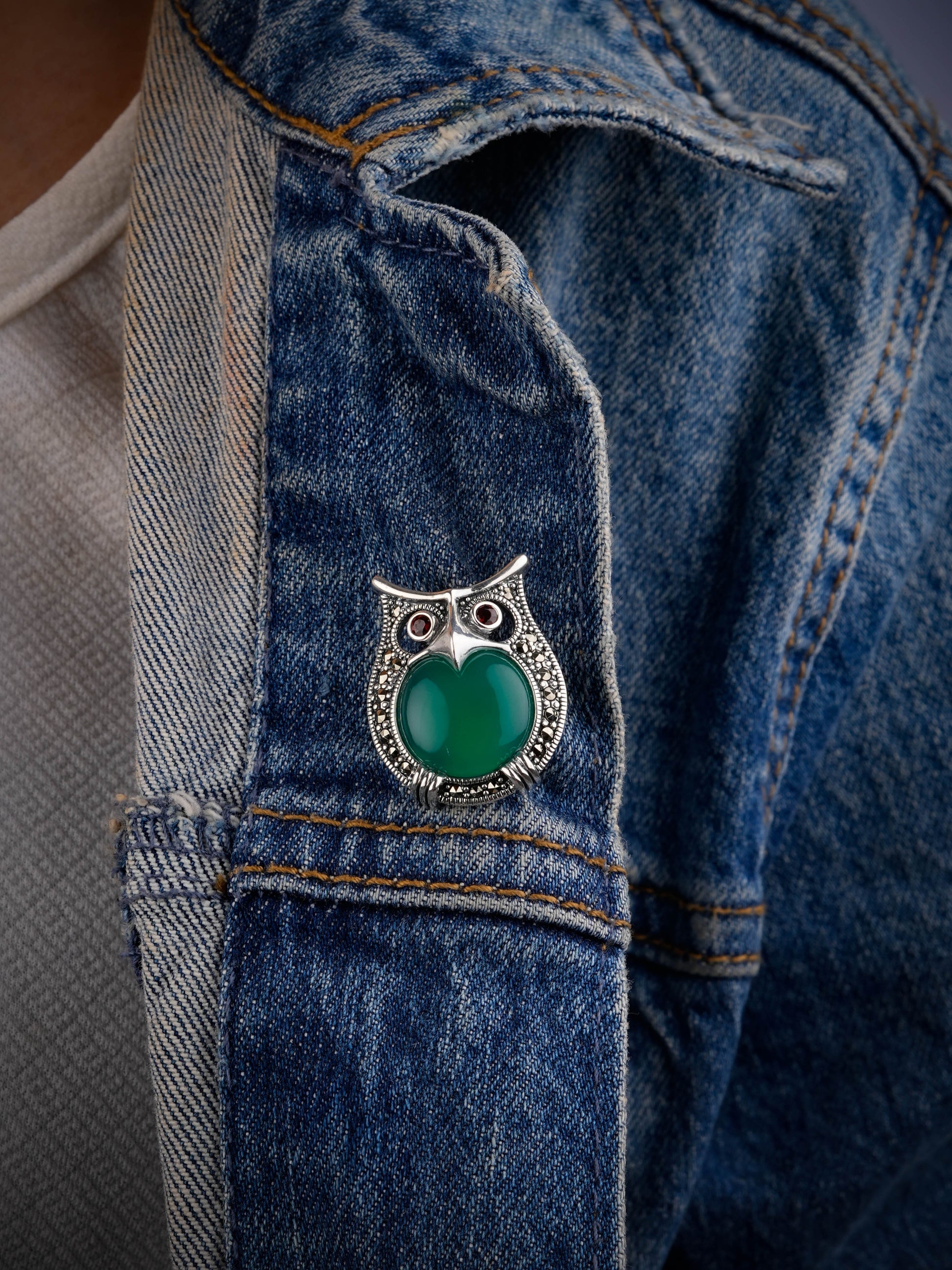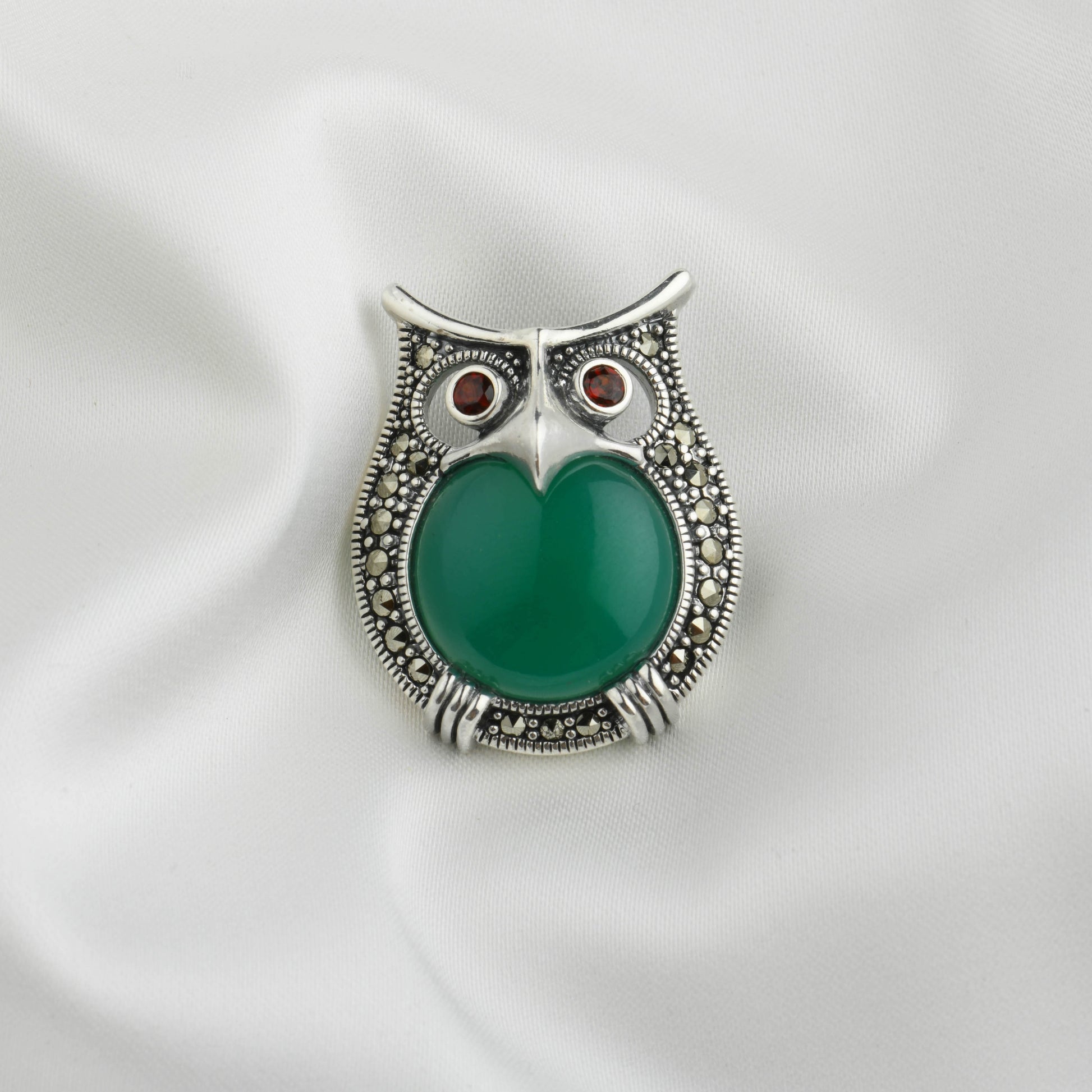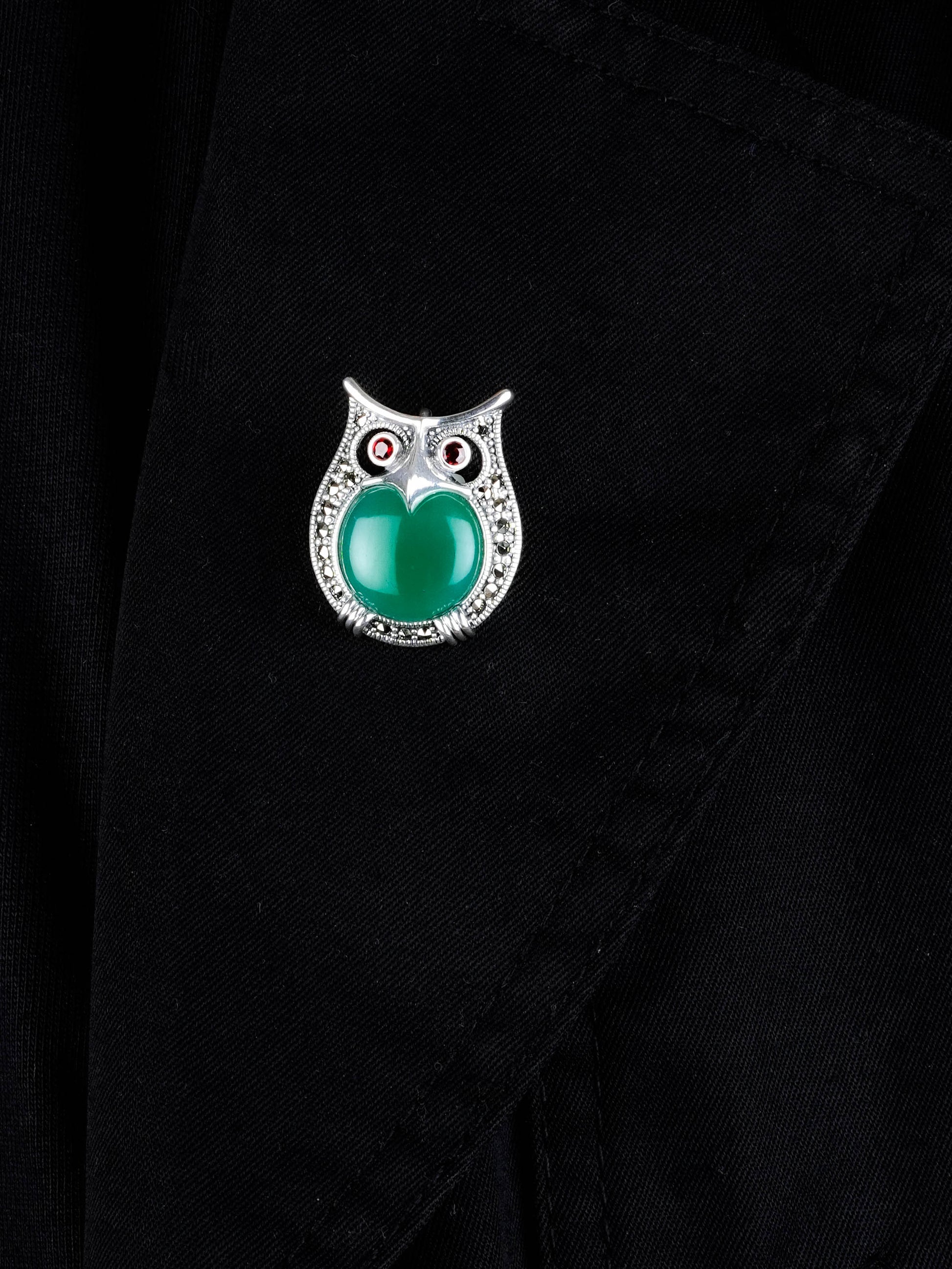 Intricate marcasite detailing highlights the owl's feathers and adds a touch of vintage charm.