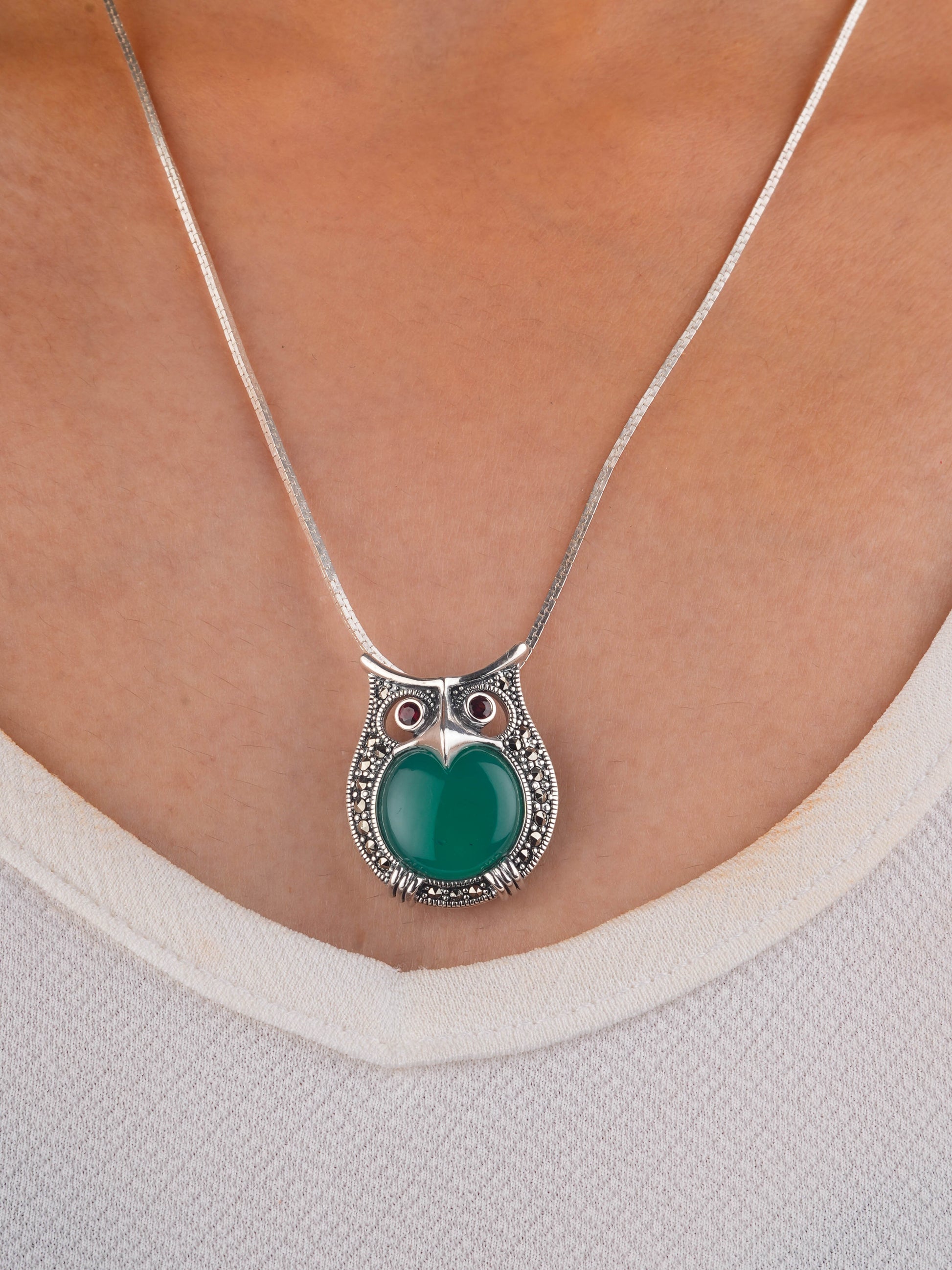 Embrace timeless elegance with the Mystic Green Onyx Owl Garnet-eyed Pendant. Crafted from sterling silver, this enchanting owl features a captivating green onyx at its center and red garnet eyes, symbolizing growth, renewal, and protection.